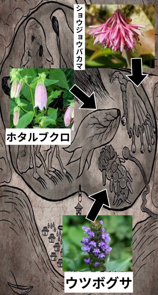 妖怪7体の正体は?男性をだますカムフラージュ+逃走ルートの花(目印)を混ぜた絵